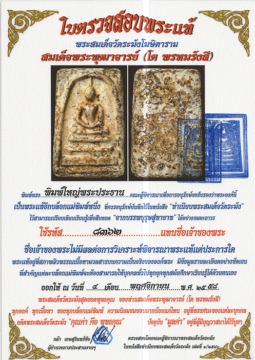 ปล่อยเช่าพระสมเด็จวัดระฆังพิมพ์ใหญ่พระประทาน พร้อมใบเซอร์