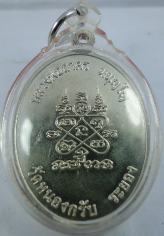 "หลวงพ่อสาคร มนุญโญ" ขอบโค้งด้านล่าง เขียนคำว่า "วัดหนองกรับ ระยอง"