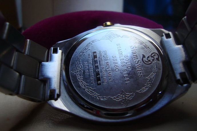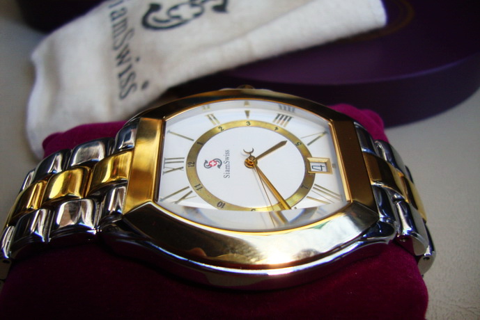 ขาย SiamSwiss นาฬิกาคุณภาพสวิสแบรนด์แรกของคนไทย ผลิตด้วยความพิถีพิถันในทุกรายละเอียด โดยใช้วัสดุชั้นเยี่ยมผสานกับเทคโนโลยีชั้นยอดของสวิส เริ่มตั้งแต่ตัวเรือนและสาย ผลิตจาก 100% Solid Stainless Steel เกรดสูงสุด 316 แอล เคลือบทองคำ 23 เค ด้วยระบบ IPG ถึง 3 ชั้น ชั้นแรก ไทยทาเนียมไนไตรด์ ชั้นที่ 2 ไนไตรด์ผสมทองคำ และชั้นนอกสุดทองคำล้วน ตัวล็อคสาย Spring Butterfly ใช้งานสะดวกและคงทนพร้อมแกะสลักสัญลักษณ ์หน้าปัดและเข็มถูกออกแบบและผลิตอย่างพิถีพิถัน เม็ดมะยมแกะสลักสัญลักษณ์ ฝาหลังแกะสลักลายอันวิจิตร ใส่ถ่านl สภาพ 95% ขายราคา 4,000.-( ทางโทร 081-6818887 )
